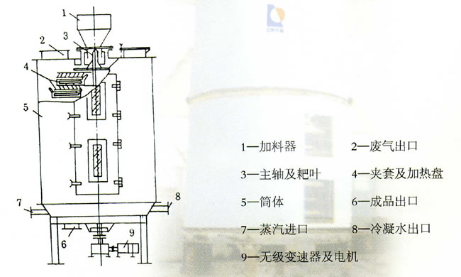 本机夹套加热盘热源可用蒸汽(0.4Mpa),导热油或水,夹套盘和耙叶一般均由不锈钢成(也可根据用户要求选用其他材料),本机气体流动采用自然通风,也可根据物料性能情况配套除尘及通风装置。