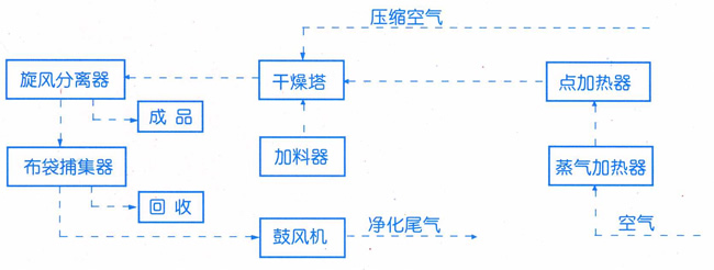 干燥器为喷泉式结构,采用压缩空气气流式雾化器或机械压力式雾化器,喷嘴经精心设计制造,雾化性能良好,能制取直径30微米左右的细粉。由于湿物料以喷泉式雾化与热空气呈混流状态,故热效率较高。本装置采用旋风分离器与袋式除尘器两级捕集,能将尾气中2um以上的细粉回收,效率可达99%以上,从而确保尾气排放达到环保要求。