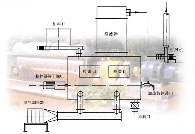 QJF内热搅拌沸腾干燥机基本结构类似一台卧式流化床,其断面为“U”型,中心有一根水平空心轴贯通,轴上以同心圆布置多层螺旋盘管,盘管外焊有与轴线成一定交角的括板,括板与壳体之间保持很小的间隙。水平旋转轴螺旋盘管中都通有加热载体,构成极大的传热表面。干燥机“U”形壳体上有特殊设计的通道引入热风,壳体的前端设有加料口,后端设有溢流堰板和排料口,被干燥物料从加料口加入后,一方面在搅拌轴上刮板和热风的共同作用下得到分散、沸腾,一方面被螺旋盘管传热表面和热风所加热,从而物料中的湿份得到蒸发,同时向出口一侧移动,最后越过溢流堰板从排料口排出,通过调节加料速度、干燥机主轴和溢流堰板位置,可有效控制物料干燥时间及产品最终含湿量。干燥机的加热载体可选择饱和蒸汽、导热油、热水或负压蒸汽等。